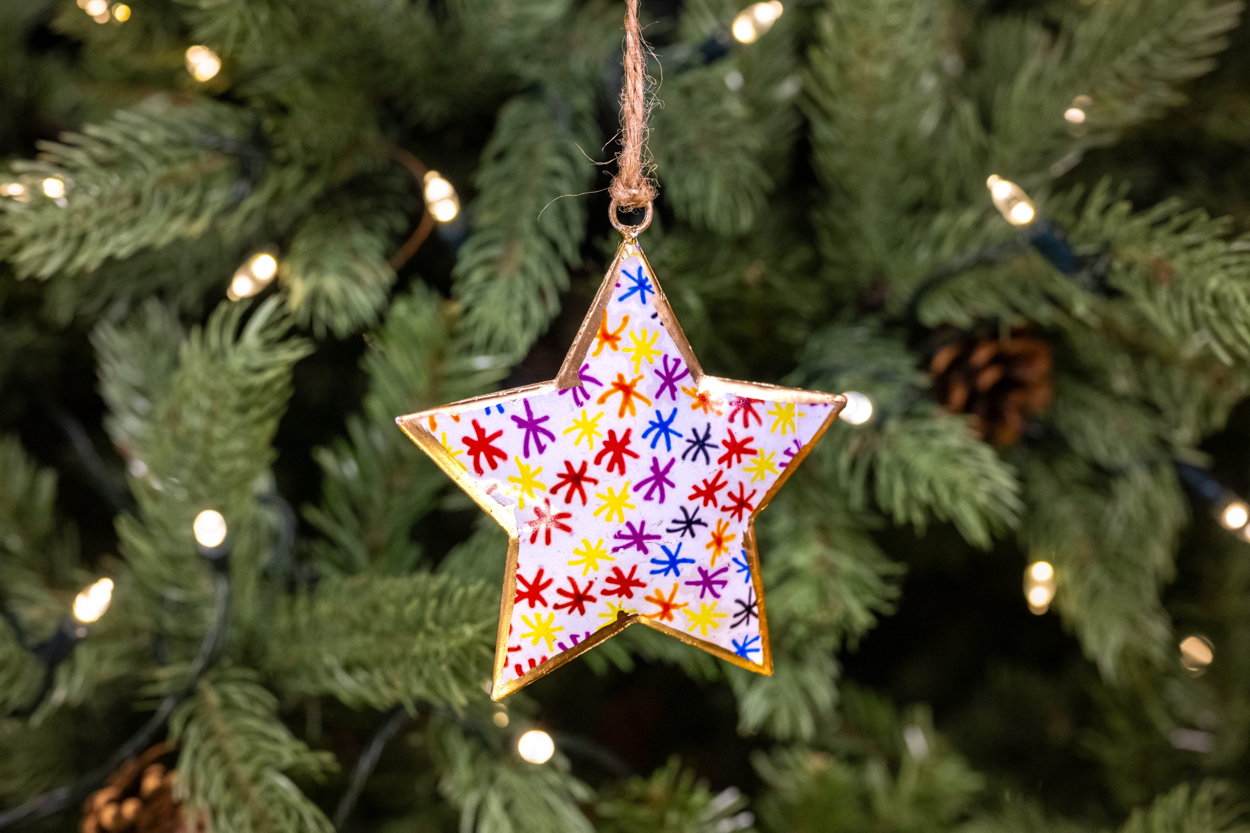 These Fairtrade, pretty metal decorations are decorated with a pattern created by 16-year-old Seema and her friends, at a club Save the Children supports in Nepal. Each one is carefully made by hand, applying hand printed transfers onto the metal base, an intricate process which is carried out in water and which contributes to their wonderful handmade appeal.