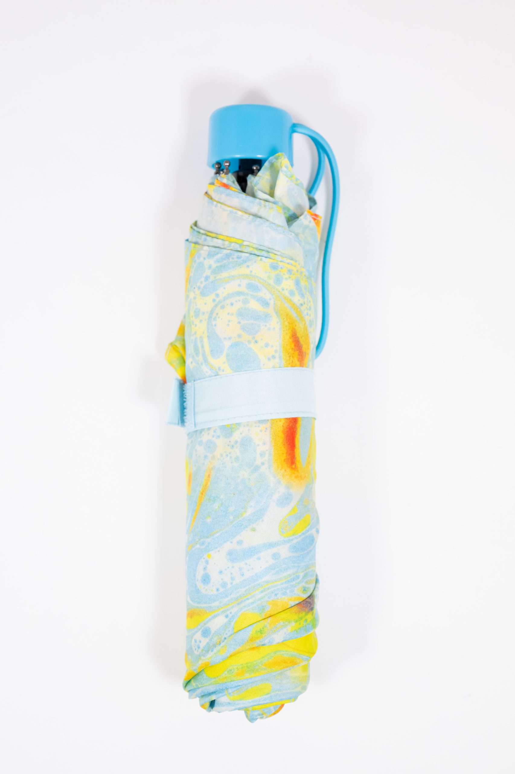 Manual umbrella that folds down making it convenient for everyday handbag use. The canopy fabric is made from recycled plastic bottles.